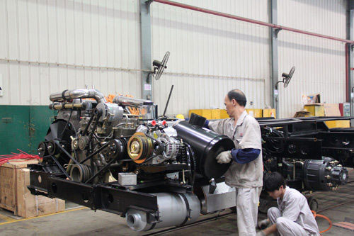 車間里,工人師傅正在組裝發(fā)動機。