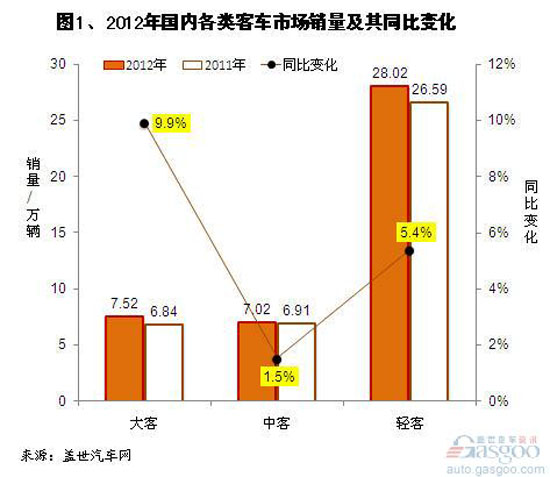 受校車安全、節(jié)能環(huán)保關(guān)注度的提升以及“公交優(yōu)先”政策受越來(lái)越多城市的重視等利好因素影響,2012年我國(guó)客車市場(chǎng)仍然呈現(xiàn)增長(zhǎng)形勢(shì),表現(xiàn)好于商用車整體形勢(shì),但受宏觀經(jīng)濟(jì)走弱拖累,其市場(chǎng)表現(xiàn)低于行業(yè)預(yù)期。