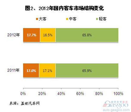 2012年,各類客車市場(chǎng)均實(shí)現(xiàn)增長(zhǎng),其中以客車市場(chǎng)附加值最高的大客市場(chǎng)走勢(shì)最為強(qiáng)勁,其銷量同比增長(zhǎng)10%至7.52萬(wàn)輛,而輕客市場(chǎng)銷量增長(zhǎng)5.4%,中客市場(chǎng)僅增1.5%。
