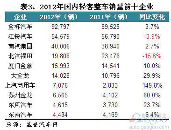 輕客市場(chǎng)中,2012年銷量前十企業(yè)依次是金杯汽車、江鈴控股、南汽集團(tuán)、北汽福田、廈門金旅、大金龍、上汽商用車、蘇州金龍、東風(fēng)汽車和東南汽車。其中,金杯汽車霸主地位不可動(dòng)搖,2012年銷量實(shí)現(xiàn)9.28萬(wàn)輛,遠(yuǎn)高于其他企業(yè),比銷量第二高的江鈴控股高出3.82萬(wàn)輛。