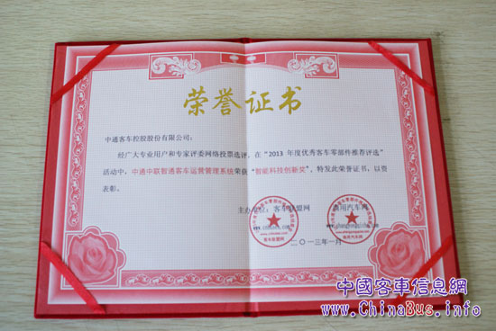 2013年1月8日,由行業(yè)內(nèi)知名媒體客車聯(lián)盟網(wǎng)、商用汽車網(wǎng)聯(lián)合主辦的“客車風云榜”年度盛典系列之“2013年度優(yōu)秀客車零部件推薦評選”活動在京落下帷幕,評選結果共選出包括中通中聯(lián)智通、宇通安芯校車智能管理系統(tǒng)、玉柴、濰柴等在內(nèi)的22家客車運營智能產(chǎn)品及優(yōu)秀客車零部件品牌。由廣大用戶、網(wǎng)友和行業(yè)專家評選的中通中聯(lián)智通榮膺智能科技創(chuàng)新獎。