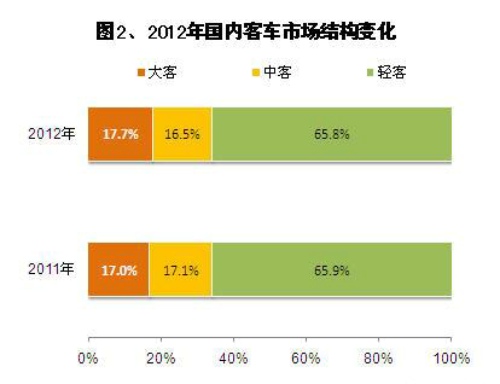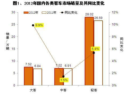 2012年,各類(lèi)客車(chē)市場(chǎng)均實(shí)現(xiàn)增長(zhǎng),其中以客車(chē)市場(chǎng)附加值最高的大客市場(chǎng)走勢(shì)最為強(qiáng)勁,其銷(xiāo)量同比增長(zhǎng)10%至7.52萬(wàn)輛,而輕客市場(chǎng)銷(xiāo)量增長(zhǎng)5.4%,中客市場(chǎng)僅增1.5%。