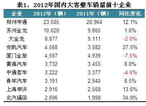 2012年大客市場(chǎng)銷(xiāo)量前十企業(yè)依次是鄭州宇通客車(chē)、蘇州金龍、大金龍、安凱汽車(chē)、廈門(mén)金旅、黃海汽車(chē)、中通客車(chē)、青年汽車(chē)、上海申沃和北汽福田。與2011年相比,安凱汽車(chē)超過(guò)廈門(mén)金旅,排名由第五升至第四位。