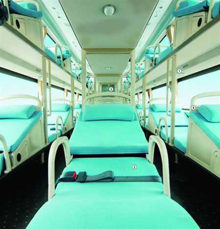 今年7月25日,中通代臥客車“世紀(jì)星”在山東威!虾>路投入運(yùn)營。該款代臥客車設(shè)置了活動座椅來滿足乘客躺臥需求,智能管理系統(tǒng)可根據(jù)司機(jī)眨眼次數(shù)判斷其是否疲勞駕駛并作出提醒,司機(jī)連續(xù)開車超過4小時將發(fā)出提醒警報,GPS定位系統(tǒng)可全程監(jiān)視客車行駛過程。還解決了臥鋪客車安全通道不暢通、安全出口小等問題。海格、宇通等企業(yè)也開發(fā)出了代臥客車。