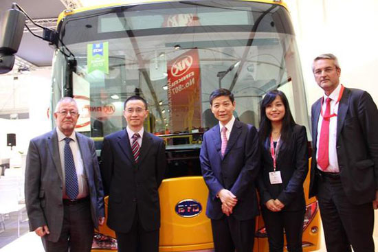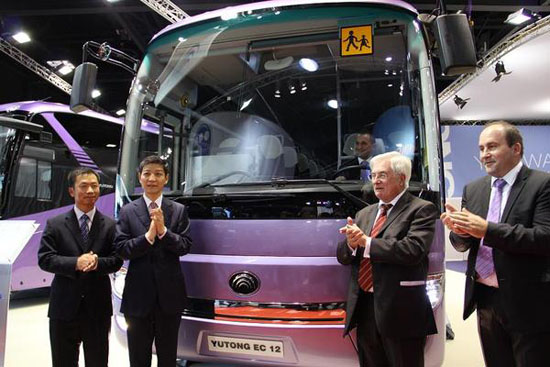 廖大使和Luc Glorieux等嘉賓為宇通兩款12米和9米的新車揭幕,宇通公司負(fù)責(zé)人介紹了企業(yè)概況以及參展車型的性能和特點(diǎn)。廖大使隨后在組委會(huì)陪同人員引導(dǎo)下看望其他中國(guó)參展商。比亞迪推出了全新的純電動(dòng)客車ebus,完全實(shí)現(xiàn)零排放。安徽安凱不僅展出了最新型號(hào)客車,還展示了用于2012年倫敦奧運(yùn)會(huì)期間的雙層旅游觀光巴士。廈門金龍公司展出了采用歐6標(biāo)準(zhǔn)的第40000輛出口客車,顯示了強(qiáng)勁的國(guó)際競(jìng)爭(zhēng)能力。