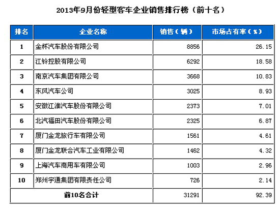 2013年9月輕型客車(chē)企業(yè)銷(xiāo)售排行前十