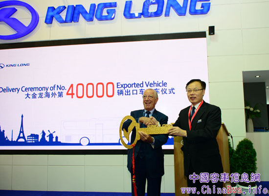 2013年10月,中國客車領軍企業(yè)大金龍第五次參加BUSWORLD歐洲展,推出三款達到歐六排放標準的精品公路客車,緊跟歐洲客車市場發(fā)展步伐,也顯示了大金龍穩(wěn)步拓展歐盟市場的決心。展會上,大金龍還舉行了海外出口車第40000輛交車儀式,向世界展示大金龍海外拓展取得的成就。