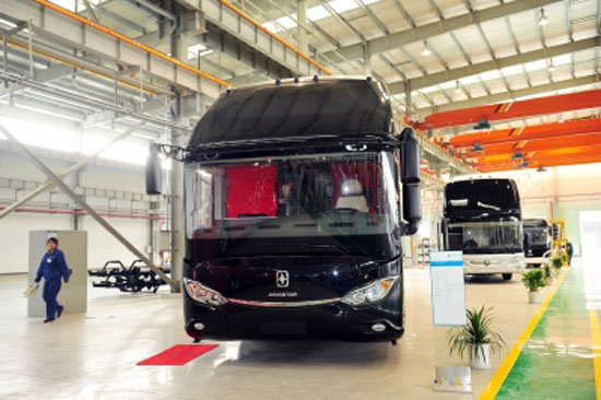 在濰柴亞星新廠區(qū)的焊裝車間內(nèi),停放著一輛剛下線不久的黑色大客車,車的后輪有兩排,長(zhǎng)度明顯比其他車型長(zhǎng)。這就是前不久剛亮相的“黑金剛”—國(guó)內(nèi)尺寸最大的公路客車。