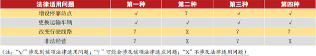 綜上,道路客運(yùn)四種接駁運(yùn)輸形式,均涉及增設(shè)?空军c(diǎn)、更換運(yùn)輸車輛問(wèn)題,部分形式可能會(huì)涉及改變行駛線路、縮減發(fā)車班次甚至非法經(jīng)營(yíng)問(wèn)題。