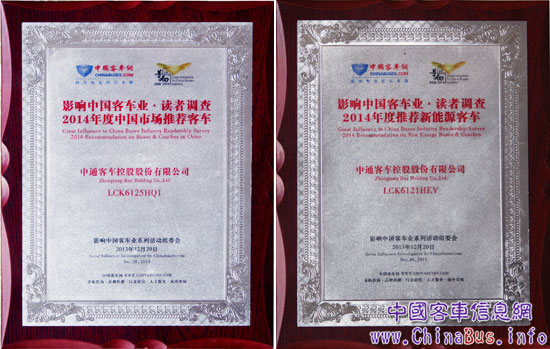 2013年12月20日,“第八屆影響中國(guó)客車業(yè)-客車行業(yè)讀者調(diào)查評(píng)選活動(dòng)”頒獎(jiǎng)典禮在北京隆重舉行,中通客車成為了本次活動(dòng)最耀眼的明星,一舉捧得了“2014年度中國(guó)市場(chǎng)、海外市場(chǎng)、新能源客車、專用校車推薦車型獎(jiǎng)以及最佳雇主”五項(xiàng)大獎(jiǎng)。