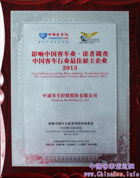 2013年12月20日,第八屆“影響中國(guó)客車(chē)業(yè)系列活動(dòng)”在北京華膳園溫泉飯店落下帷幕。通過(guò)該活動(dòng)前期的面向全行業(yè)的網(wǎng)絡(luò)投票評(píng)選,最受矚目的年度最佳雇主大獎(jiǎng)花落中通客車(chē)。