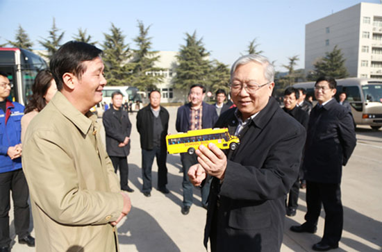 在展車現(xiàn)場,路甬祥院士一行還參觀了宇通自主研發(fā)的校車、商務(wù)車、新能源客車等產(chǎn)品,并饒有興致地登上展車。路甬祥院士就宇通新能源客車的技術(shù)路線、節(jié)能減排效果、市場表現(xiàn)、相關(guān)政策等與湯玉祥進行了深入交流,對公司的新能源產(chǎn)品技術(shù)路線和市場表現(xiàn)給予贊賞,并對宇通新能源客車的研發(fā)工作表示支持。參觀結(jié)束,湯玉祥向路甬祥贈送校車車模作為紀念。