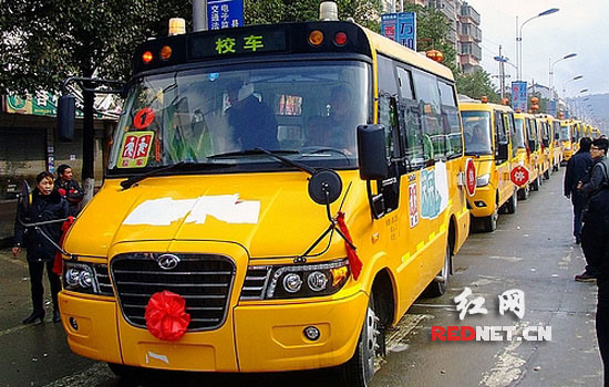 2月22日,湖南省綏寧縣城,16臺嶄新的“大鼻子”校車正整裝待發(fā)。綏寧地處湘西南偏遠山區(qū),今年,綏寧縣耗資500萬元,配備GPS衛(wèi)星定位系統(tǒng)、車門警報、應急逃生裝置、急救醫(yī)療箱、消防滅火器等安全裝備的50余臺校車將分批配發(fā)到全縣偏遠學校。