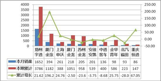 累計銷售前5名依次為鄭州宇通、廈門金旅、廈門金龍、蘇州金龍和金華青年,累計銷量分別為3786輛、1182輛、1051輛、958輛和586輛。