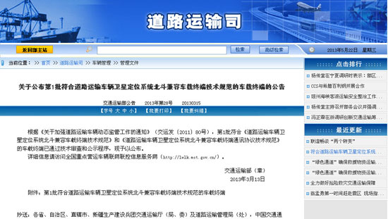 2013年起,交通運(yùn)輸部在天津、河北等9個(gè)省份展開示范,為需要更新車載終端的在用“兩客一!避囕v和所有新進(jìn)入運(yùn)輸市場(chǎng)的重型載貨汽車、半掛牽引車,加裝北斗/GPS雙模車載終端。
