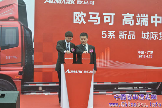 福田歐馬可業(yè)務(wù)總監(jiān)顧德華與北京福田康明斯發(fā)動(dòng)機(jī)有限公司總經(jīng)理關(guān)章華在歐馬可5系新品前合影