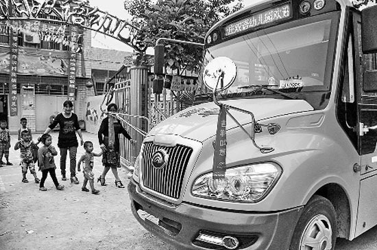 5月21日,在南陽社旗縣太和鎮(zhèn)范樓村幼兒園,孩子們準(zhǔn)備乘坐“大鼻子”新校車放學(xué)回家。該村幼兒園出資20多萬元購買了一臺符合國家標(biāo)準(zhǔn)的校車,確保該園幼兒乘車安全。