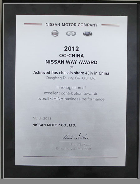 5月29日,東風(fēng)旅行車公司榮獲全球日產(chǎn)總裁特別獎2012年財年OC中國獎。東風(fēng)旅行車有限公司在2012年獲得中國國內(nèi)底盤40%市場保有量,日產(chǎn)總裁特別獎2012年財年OC中國獎授予東風(fēng)旅行車公司,以表彰對中國業(yè)務(wù)卓越貢獻。日產(chǎn)每年全球僅頒發(fā)6家企業(yè)總裁特別獎,東風(fēng)有限兩家上榜,東風(fēng)旅行車公司位列其中。同時,東風(fēng)旅行車公司還榮獲東風(fēng)有限“總裁特別獎”。