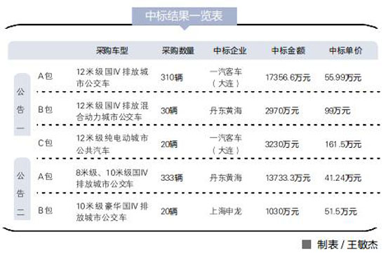 編者按 6月8日,大連市713輛公交車采購項目中標(biāo)公告發(fā)布,所購車輛均為新能源和符合國Ⅳ排放標(biāo)準(zhǔn)的清潔能源車。本期《政府采購信息報》特從招投標(biāo)過程和中標(biāo)企業(yè)方面進(jìn)行報道,以期對各地公交車采購和企業(yè)投標(biāo)提供一定的借鑒。