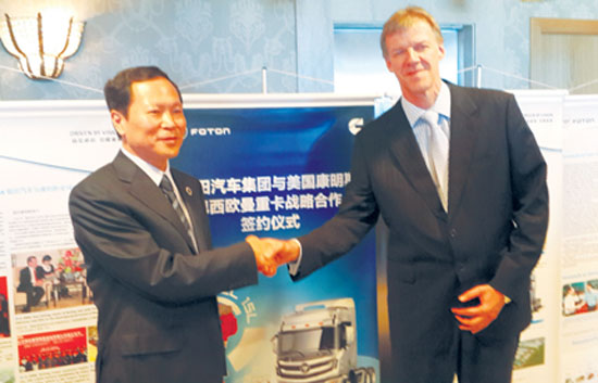 福田汽車與美國康明斯巴西商用車戰(zhàn)略合作項目簽約。左為:福田汽車總經(jīng)理王金玉,右為:康明斯公司副總裁LuisPasquottp。