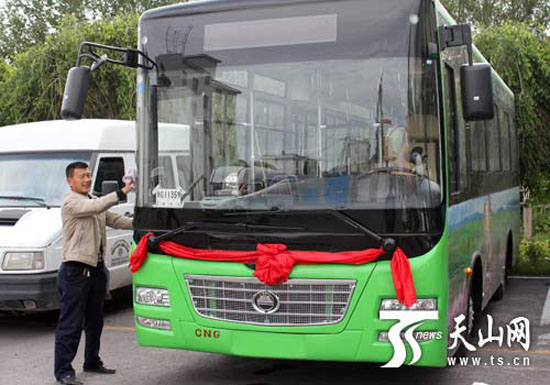 裕民縣城鄉(xiāng)客運(yùn)公交公司司機(jī)王開昌正在擦洗新公交車