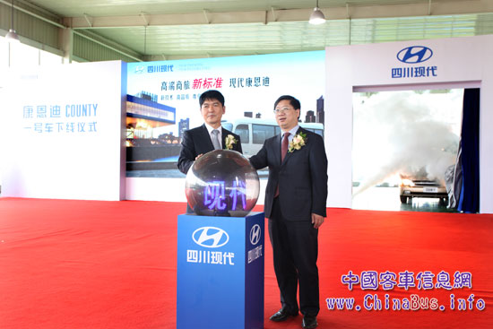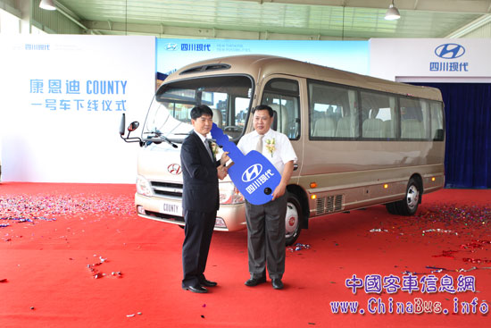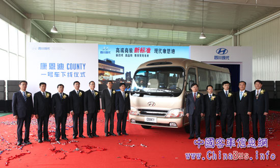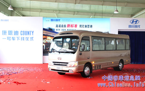 2013年8月8日,四川現(xiàn)代汽車全新打造的首款高端商旅巴士COUNTY康恩迪在成都溫江工廠正式下線。國內(nèi)的主要日刊、雜志和網(wǎng)絡(luò)等20多家主流媒體受邀參與此次儀式,與四川現(xiàn)代的主要領(lǐng)導(dǎo)、經(jīng)銷商及客戶代表200余人共同見證這一歷史時刻,F(xiàn)代康恩迪的成功下線,不僅意味著將改變中國高端商旅巴士市場的競爭格局,更體現(xiàn)了四川現(xiàn)代進(jìn)軍中國商用車市場的雄厚實(shí)力和發(fā)展信心。