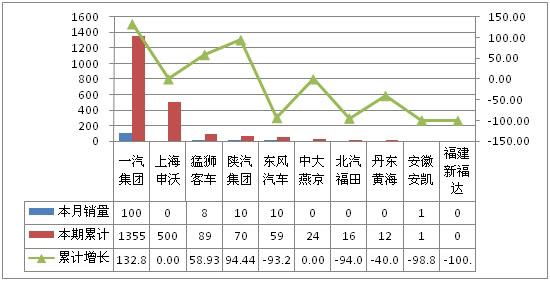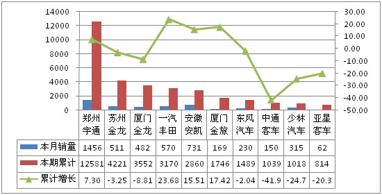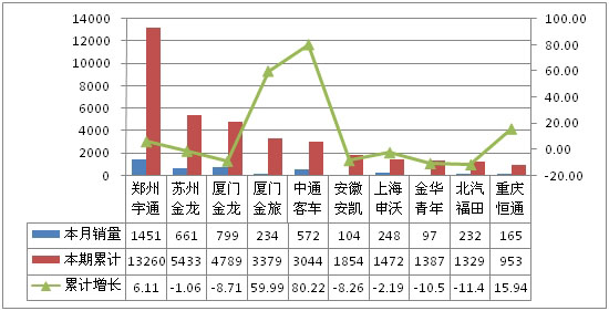 累計銷售前5名依次為鄭州宇通、蘇州金龍、廈門金龍、一汽豐田和安徽安凱,累計銷量分別為12581輛、4221輛、3552輛、3170輛和2860輛。