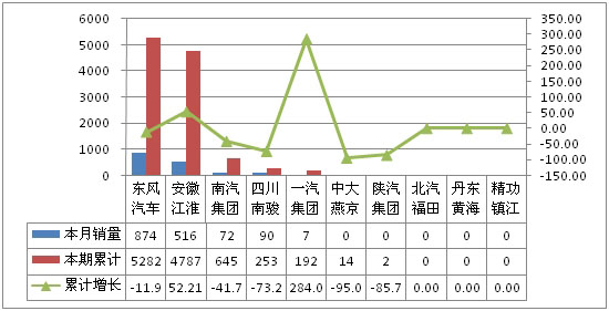 累計銷售前5名依次為金杯汽車、江鈴控股、南汽集團、北汽福田和廈門金龍,累計銷量分別為59883輛、36725輛、23611輛、16647輛和8753輛。