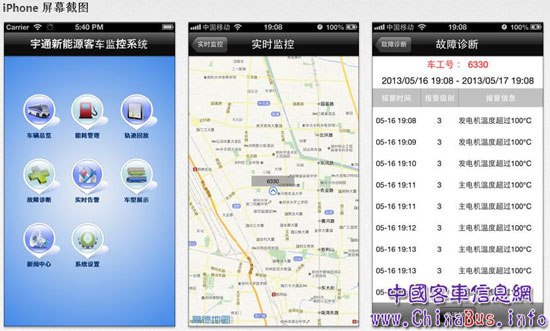 根據(jù)宇通相關(guān)技術(shù)人員的介紹,宇通新能源移動(dòng)應(yīng)用將帶給用戶快捷、輕便、實(shí)用的使用體驗(yàn),其中的每個(gè)功能都是通過用戶在車輛的日常管理中經(jīng)常使用的功能進(jìn)行提煉。比如車輛總覽功能,用戶可以快速察看車輛總數(shù)、在線狀態(tài)、地理位置、里程、能耗以及其他系統(tǒng)參數(shù)信息;能耗管理功能是指用戶可以靈活設(shè)置時(shí)段對車輛的能耗和總行駛里程進(jìn)行計(jì)算和圖表生成,快速直觀地掌握車輛能耗趨勢;軌跡回放功能可方便用戶查看行車軌跡、起始點(diǎn)、終點(diǎn)和行駛里程;故障診斷,可幫助用戶及時(shí)查詢并顯示車輛在行車時(shí)各個(gè)零部件的故障碼,并根據(jù)故障碼手冊快速定位故障;實(shí)時(shí)告警功能可使用戶實(shí)時(shí)查看目前車隊(duì)內(nèi)車輛的最新報(bào)警信息,快速定位車輛和故障;另外,該應(yīng)用還集成了車型展示功能,用戶可隨時(shí)登陸查詢宇通新能源客車的車型介紹和配置參數(shù);有關(guān)宇通客車新能源產(chǎn)品的最新動(dòng)態(tài)和媒體報(bào)道,用戶則可通過“新聞中心”的功能隨時(shí)關(guān)注。