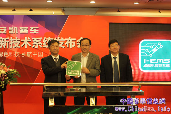 中國(guó)汽車(chē)工程學(xué)會(huì)常務(wù)副理事長(zhǎng)兼秘書(shū)長(zhǎng)張進(jìn)華、安凱客車(chē)總經(jīng)理童永、副總經(jīng)理熊良平共同向媒體展示安凱I-EMS卓越電管理系統(tǒng)