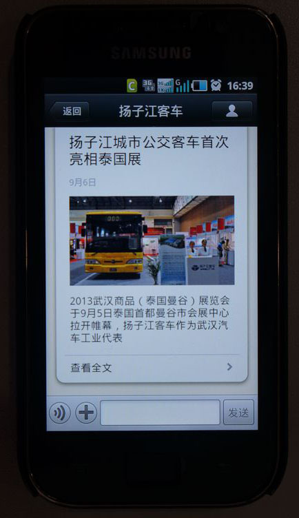 2013年8月,“揚子江客車”微信公眾服務平臺率先開通,全新推出。揚子江成為客車行業(yè)首家利用微信平臺開展品牌建設的企業(yè),引領了信息建設的新潮流,成為行業(yè)的佼佼者。