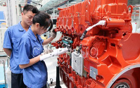 說明:2013年9月4日,位于安徽蕪湖三山經(jīng)濟(jì)開發(fā)區(qū)的玉柴聯(lián)合動力股份有限公司,工人在裝試車間“6K13N天然氣發(fā)動機(jī)”流水線上工作。