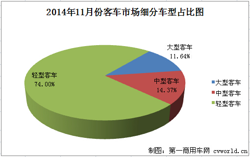 據(jù)中國(guó)汽車工業(yè)協(xié)會(huì)統(tǒng)計(jì),2014年11月份,國(guó)內(nèi)客車(含非完整車輛)市場(chǎng)產(chǎn)銷57615輛和56189輛,產(chǎn)銷環(huán)比分別增長(zhǎng)13.22%和16.24%,同比分別增長(zhǎng)8.01%和10.29%,銷量增幅較10月大幅擴(kuò)大(10月客車市場(chǎng)銷量同比僅增長(zhǎng)0.01%)。分車型看,大型、中型和輕型客車分別銷售6538輛、8073輛和41578輛,分別占11月份客車市場(chǎng)份額的11.64%、14.37%和74.00%。