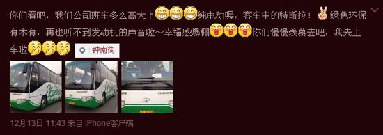 那么,當(dāng)班車再貼上一張綠色標(biāo)簽,高大上的感覺有沒有?近日,某企業(yè)工作的冷先生分享了這樣一條微博:單位班車高大上,純電動(dòng)喔,班車中的特斯拉,幸福感爆棚……”