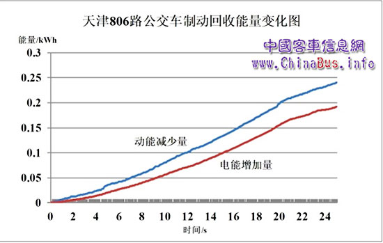 上圖為天津806路公交車運營過程中某次剎車制動回收能量的變化圖,系統(tǒng)在剎車或滑行時采用制動能量回收策略,將車輛動能轉(zhuǎn)換為電能回收至電池和電容存儲,以供車輛后續(xù)運行。上圖中藍(lán)色曲線為車輛動能的減少量、紅色曲線為電池和電容中的電能的增加量,由圖可直觀看出,紅色曲線緊隨藍(lán)色曲線,說明減少的動能大部分轉(zhuǎn)化為電能,剎車過程中電池和電容回收的總電能(紅色曲線包含的面積)與車輛減少的動能(藍(lán)色曲線包含的面積)之比(即制動回收效率)達(dá)到82.67%,充分節(jié)約能源。