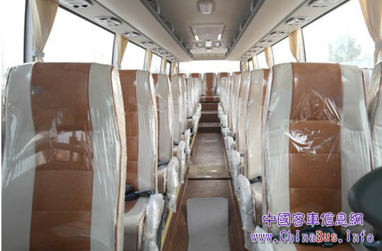 該車型在內(nèi)裝飾件的設計及選取上,對整車裝飾的色彩上都做出了技術革新。以往車型的內(nèi)飾色彩配色比較單一,且偏向于冷色調(diào)。該款SR6107TH樣車采用了雙色調(diào):上部以萊茵白為主色調(diào)(車頂風道、頂板和兩側內(nèi)飾,以及座椅兩側皮革),使人感覺輕快和舒適;下部以橘紅色為輔色調(diào)(座椅中間皮革和地板革),讓人感覺暖意由下而上,紅木紋的地板革讓人有一種家居的親切感。冷暖兩種色調(diào)相交織,整體的色彩柔和的協(xié)調(diào)在一起。
