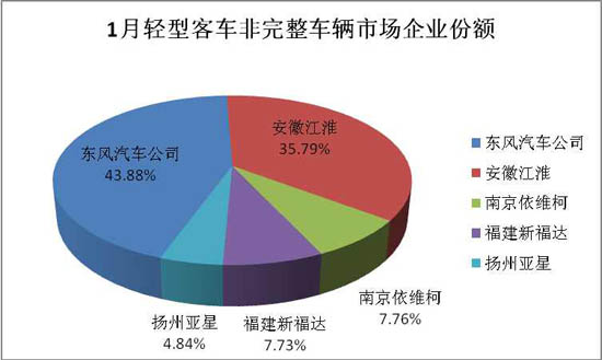 2014年1月份,輕型客車非完整車輛銷售3881輛,環(huán)比增長(zhǎng)-23.00%,同比增長(zhǎng)-28.30%。1月份,輕型客車非完整車輛銷量前5的企業(yè)依次為:東風(fēng)汽車公司、安徽江淮、南京依維柯、福建新福達(dá)和揚(yáng)州亞星。5家合計(jì)銷售3881輛,恰好分食了1月輕型客車非完整車輛市場(chǎng)的全部份額。
