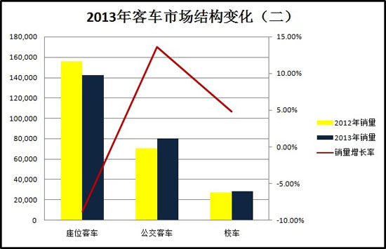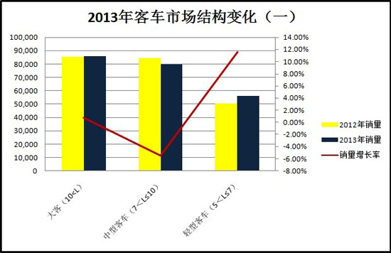 客車市場(chǎng)不但沒有趕上汽車行業(yè)總體的增幅,即使在商用車行業(yè),也屬于拖了后腿的細(xì)分領(lǐng)域。在2013年,客車市場(chǎng)表現(xiàn)低迷,不但沒有往年逆勢(shì)而長(zhǎng)的業(yè)績(jī),反而明顯弱于商用車行業(yè)平均增幅(6.4%),以全年-0.61%的降幅與2012年銷量基本持平,而部分細(xì)分板塊下滑勢(shì)頭更趨明顯。