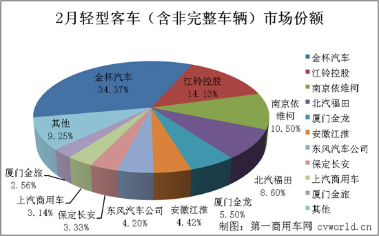 2月份,輕型客車(含非完整車輛)銷售24406輛,銷量排名前十的企業(yè)共計銷售22148輛,占據(jù)整個輕型客車(含非完整車輛)銷量份額的90.75%。排名如下: