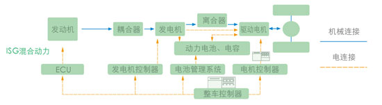 相比之下,ISG混聯(lián)系統(tǒng)采用同軸直驅(qū)方式,發(fā)動機(jī)通過耦合器直接驅(qū)動電機(jī),發(fā)電機(jī)和驅(qū)動的功率都可以做得足夠大,完全滿足城市公交車動力性需求。同時(shí),由于發(fā)電機(jī)直接放在發(fā)動機(jī)后面,不僅傳遞中幾乎沒有能量損失,還可以在車輛重載或急加速時(shí)提供輔助驅(qū)動力。