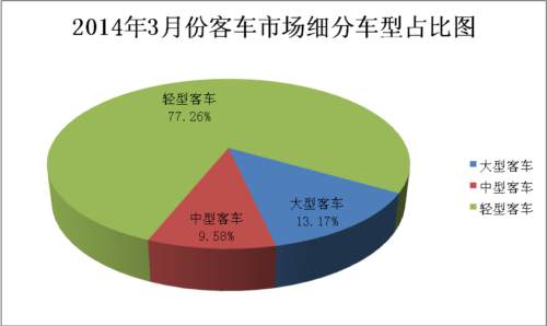 據(jù)中國(guó)汽車工業(yè)協(xié)會(huì)統(tǒng)計(jì),2014年3月份,國(guó)內(nèi)客車(含非完整車輛)市場(chǎng)產(chǎn)銷52266輛和52603輛,環(huán)比分別增長(zhǎng)69.79%和70.41%,同比分別增長(zhǎng)14.64%和13.07%。分車型看,大型、中型和輕型客車分別銷售6926輛、5038輛和40639輛,分別占客車市場(chǎng)份額的13.17%、9.58%和77.26%。