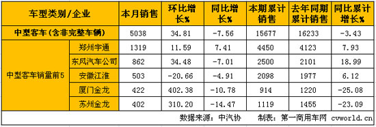 2014年3月份,中型客車(含非完整車輛)銷售5038輛,環(huán)比增長(zhǎng)34.81%,同比增長(zhǎng)-7.56%。3月份,中型客車(含非完整車輛)銷量前五的企業(yè)依次為:鄭州宇通、東風(fēng)汽車公司、安徽江淮、廈門金龍和蘇州金龍,5家合計(jì)銷售3508輛,占中型客車(含非完整車輛)總銷量5038輛的69.63%。從增幅看,鄭州宇通以7.41%的同比增幅成為唯一實(shí)現(xiàn)同比正增長(zhǎng)的企業(yè)。安徽江淮則以環(huán)比-20.66%、同比-4.91%的成績(jī)成為唯一環(huán)比、同比皆為負(fù)增長(zhǎng)的企業(yè)。