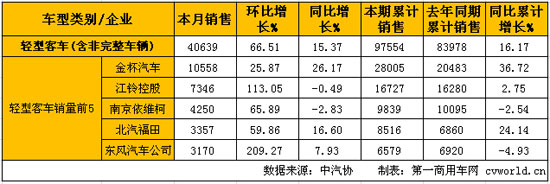 2014年3月份,輕型客車(含非完整車輛)銷售40639輛,環(huán)比增長(zhǎng)66.51%,同比增長(zhǎng)15.37%。3月份,輕型客車(含非完整車輛)銷量前5的企業(yè)依次為:金杯汽車、江鈴控股、南京依維柯、北京福田和廈門金龍東風(fēng)汽車公司。5家合計(jì)銷售28681輛,占輕型客車(含非完整車輛)總銷量40639輛的70.58%。從增幅看,銷量前五企業(yè)環(huán)比上月全部實(shí)現(xiàn)正增長(zhǎng),同比增幅僅有江鈴控股(-0.49%)和南京依維柯(-2.83%)兩家為負(fù)。