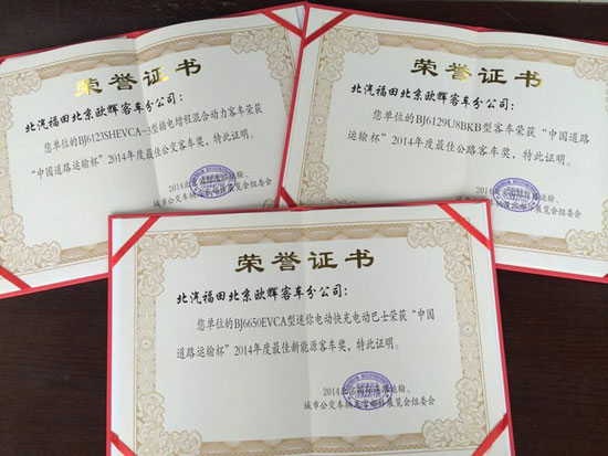 福田歐輝客車攜BJ6650迷你快充電動(dòng)巴士、BJ6129雙風(fēng)擋城間客車、 BJ6123插電增程混合動(dòng)力城市客車三款產(chǎn)品,亮相2014北京國(guó)際道路運(yùn)輸、城市公交車輛及零部件展,一舉斬獲三項(xiàng)大獎(jiǎng)。