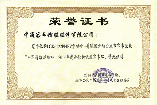 LCK6122PHEV“中國(guó)道路運(yùn)輸杯”2014年度最佳新能源客車(chē)獎(jiǎng)