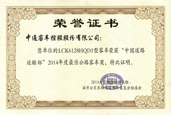 LCK6128HQD1“中國(guó)道路運(yùn)輸杯”2014年度最佳公路客車(chē)獎(jiǎng)