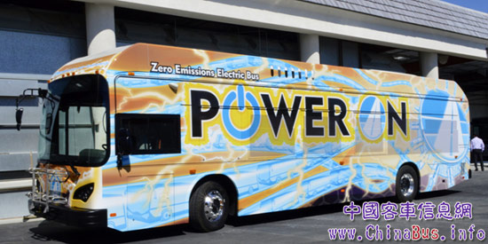 在美國(guó)加州南部蘭卡斯特大巴工廠(chǎng)生產(chǎn)的比亞迪12米純電動(dòng)大巴