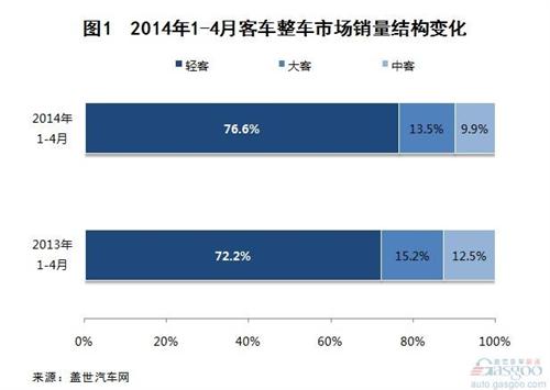 在客車主要品種中,輕型客車保持快速增長,貢獻度進一步升高,帶動客車市場整體增長。2014年1-4月,輕型客車銷量累計增長17.8%至11.94萬輛,貢獻率為76.6%,同比上升4.4個百分點。