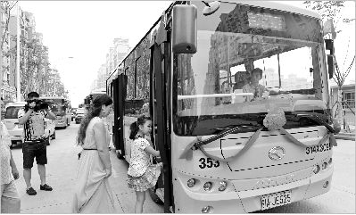 昨日,紫潤明園小區(qū),市民們正在乘坐剛開通的353路微循環(huán)公交車。2014首批微循環(huán)公交開通。