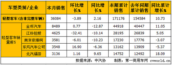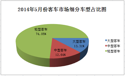 據中國汽車工業(yè)協會統計,2014年5月份,國內客車(含非完整車輛)市場產銷49755輛和48726輛,生產環(huán)比微增0.72%,銷售環(huán)比下降1.36%,生產同比增長1.91%,銷售同比下降2.97%(較4月2.85%的同比增幅轉為負增長)。分車型看,大型、中型和輕型客車分別銷售6485輛、6157輛和36084輛,分別占客車市場份額的13.31%、12.64%和74.05%。